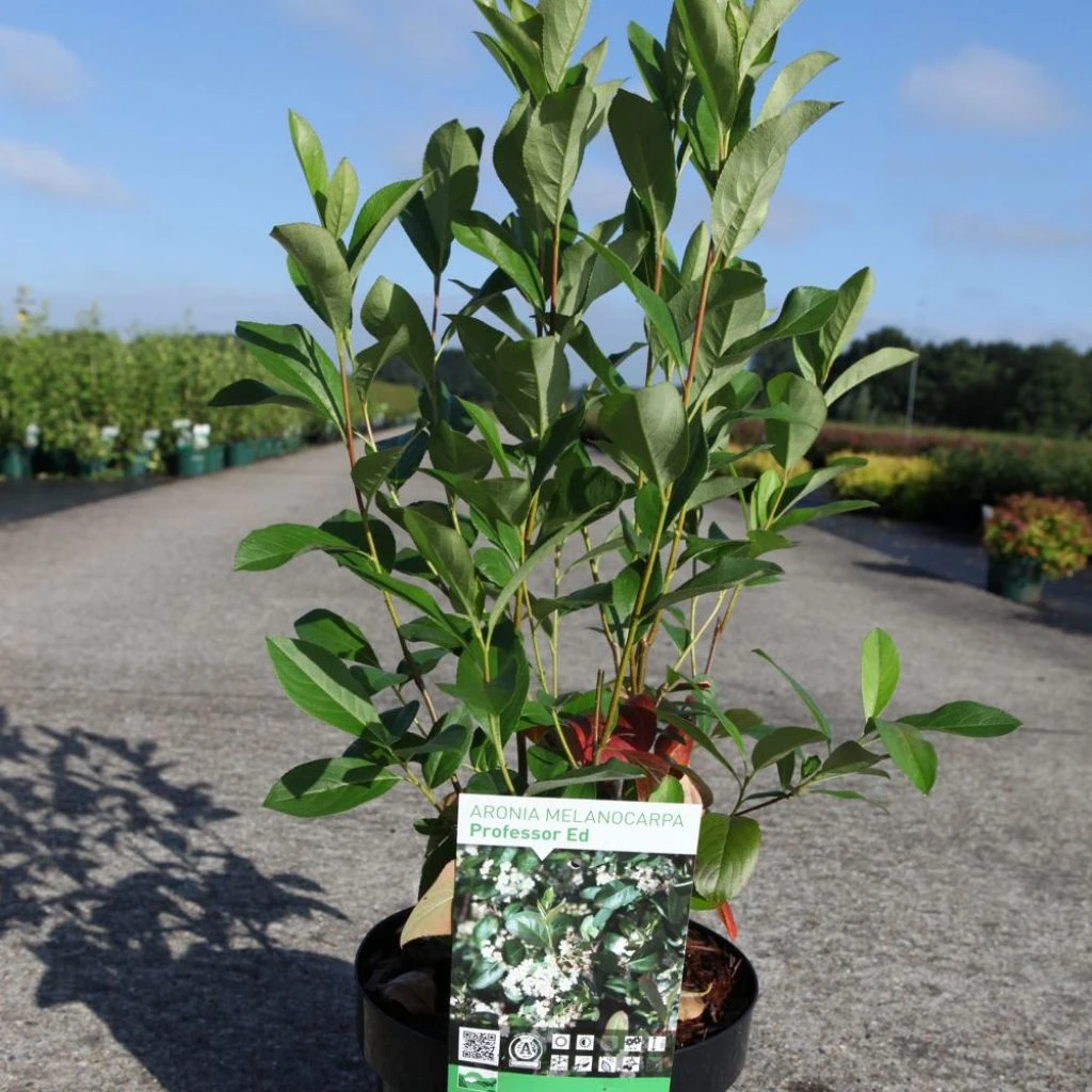 L’Aronia melanocarpa ‘Professor Ed’ appelé autrement aronie à fruits noirs, est une variété compacte convenant mieux aux jardins de petite superficie. C’est un arbuste polyvalent, donnant de jolis corymbes de petites fleurs mellifères, parfumées, blanc pur en mai-juin suivies de baies abondantes de 1 cm de diamètre d’un violet virant au noir brillant à maturité et au goût léger de cassis, très nutritives, astringentes, comestibles sous forme de confitures, gelées ou tartes. Suspendues aux pétioles fins et rouges, elles attirent aussi les oiseaux qui en raffolent. Son feuillage ovale, vert lustré prend des belles teintes rouge orangé en automne avant de tomber au sol. Originaire des zones humides du nord-est des États-Unis, il préfère les sols drainés, fertiles, neutres à acides, frais, au soleil ou à mi-ombre. C’est un arbuste simple à cultiver qui mérite une place en haie libre ou en haie fruitière.
