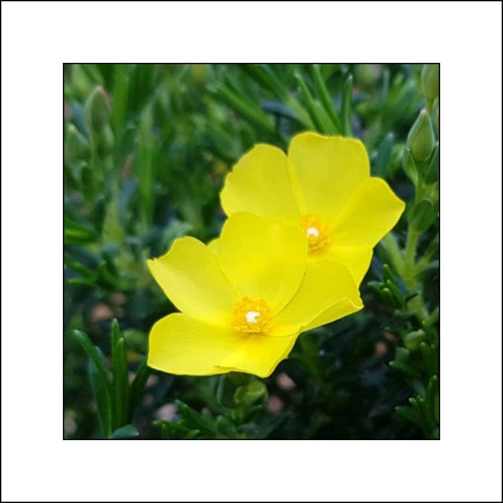 ‘April Sun’, encore peu répandu en culture, est une sélection plus florifère de cette espèce botanique. La floraison, très abondante et de longue durée, a lieu avant ou en dehors de la période de sécheresse et de chaleur estivale, d’avril à septembre en fonction du climat et du sol. A l’extrémité des rameaux apparaissent des boutons floraux verts teintés de rose, groupés en cymes qui s’épanouissent en petites fleurs simples de 3 cm de diamètre, formées de 5 pétales d’un jaune citron très vif. Le coeur de la fleur, est occupé par un bouquet d’étamines jaune-orangé. Chaque fleur disparait en fin d’après-midi, lachant sur le sol une pluie de pétales. Les boutons innombrables garantissent une longue floraison. Les feuilles sont persistantes, longues de 2 cm, à bords légèrement enroulés. Pubescentes au débourrement, elles deviennent gris-vert foncé à maturité et dégagent un arôme balsamique par temps chaud et sec. Le système racinaire de ce « ciste » est à la fois profond et ramifié, il est si puissant qu’il parvient à s’imiscer entre les roches fracturées ou dans le sable sec pour puiser la moindre trace de fraicheur en profondeur, tandis que ses racines superficielles captent l’humidité du sol en surface. Sa durée de vie varie entre 12 et 15 ans au jardin. Cette plante est sensible à l’asphyxie racinaire en sol trop compact et humide en hiver. Sa rusticité est de l’ordre de -12°C en sol correctement drainé.