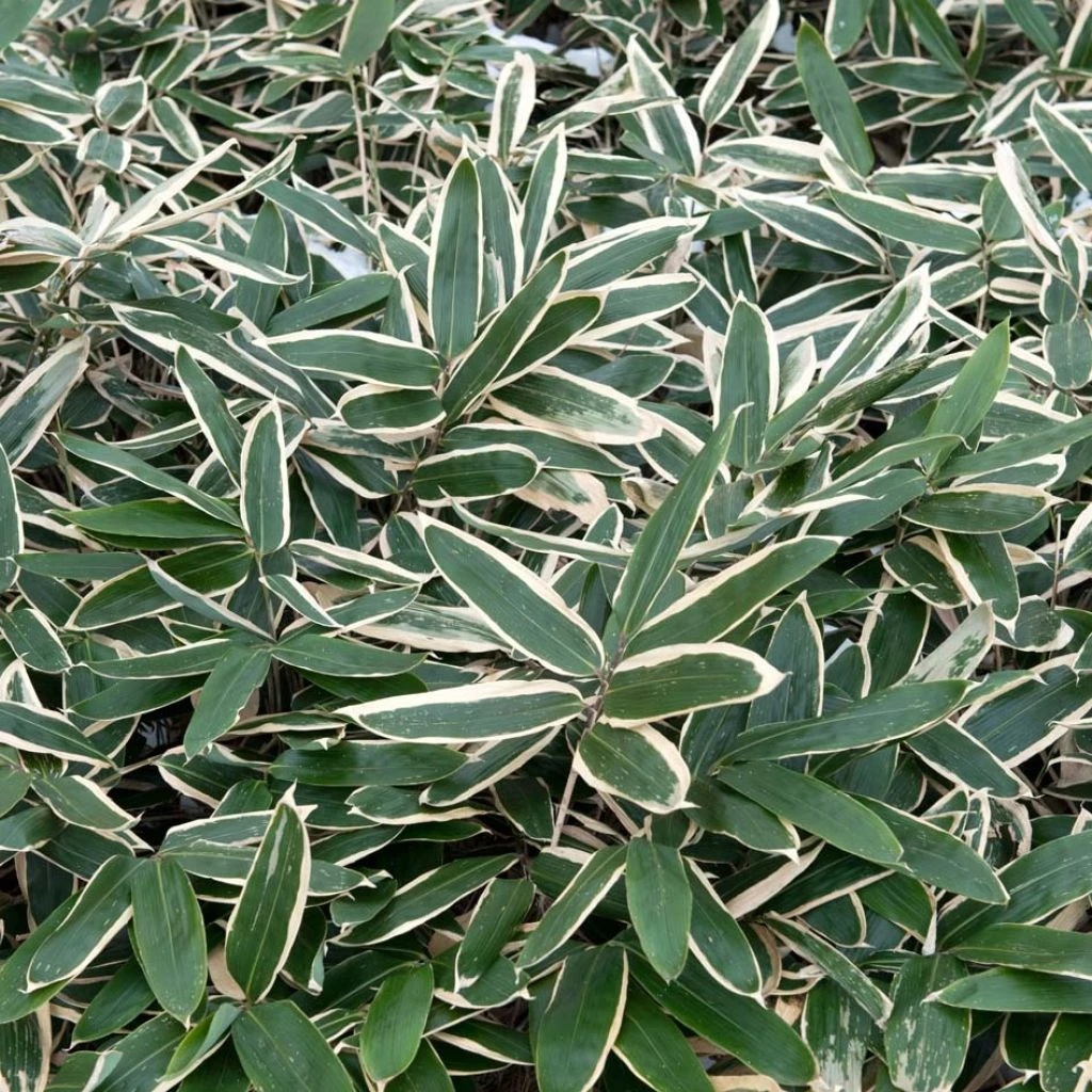 Le Sasa veitchii est un petit bambou japonais que l’on appelle parfois Sasa albo-marginata en raison de ses grandes feuilles qui se marginent de crème dès les premiers froids. Il s’agit d’un bambou à petit développement, doté d’un port buissonnant et dense, arborant un feuillage réellement splendide et dont l’abondance masque souvent les chaumes grêles. Peu traçant et d’une excellente rusticité, il se plait au soleil léger, comme à l’ombre dense, en tout sol frais sans excès de calcaire. Incontournable dans un jardin japonais, il excelle aux abords des points d’eau !